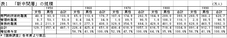 そこで女性事務職を新中間層から除外すると、新中間層の就業人口に占める比率は1950年で11.2%、1990年では19.1%となる。確かに全体に占める比率は増加しているが、その増加率は被雇用者全体の増加率より低く、被雇用者に占める比率は低下している。その中で女性が占める比率は、1950年が10.4%、1990年は22.3%と増大してはいるが、依然として2割強にとどまる。「新中間層の拡大」という見解は、女性差別を無視することによって成立する言説だったのである。