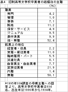 果たしてそうであろうか。表4.は1995年SSM調査から算出した、高等女学校卒業者の結婚後の主職である。確かに無職が約半数を占めてはいる。しかし専門・管理・事務・販売職に就いた者の比率は23.5%に上り、決して少ないとはいえない。就業上の地位から見ると、家族従業者が21.9%と多いのは当然としても、経営者・役員と常雇一般従業者が13.2%、自営業主・自由業者が7.7%に上っている。高等女学校卒業者は決して専業主婦ばかりだったわけではない。ところが天野らの研究では、「女性=専業主婦」というそもそもの前提をおいたことから、女性本人についての事実の究明が結婚時点まででストップし、以後は所属階層が配偶者の所属階層に還元されてしまうのである。