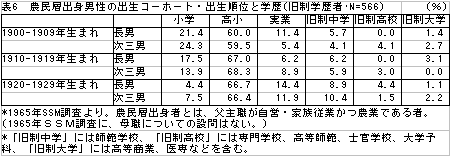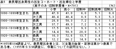 図表5.は、農民層出身者の学歴を出生コーホート別・出生順位別にみたものである。確かに1910-19年生まれのコーホートでは、次三男の方が学歴が高いといえる。しかし中学以上への進学率の差は2倍程度であり、長男への学歴の抑制が支配的だったとはいえない。逆に1900-09年生まれコーホートでは、高小以上への進学率は長男の方が高い。全体的に見て、次三男の方が学歴が高いというのは、必ずしも一般的な傾向ではない。