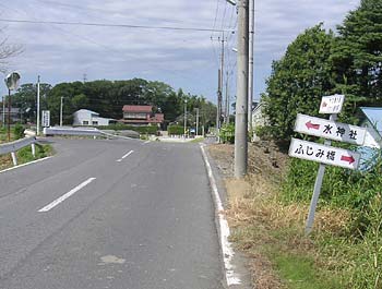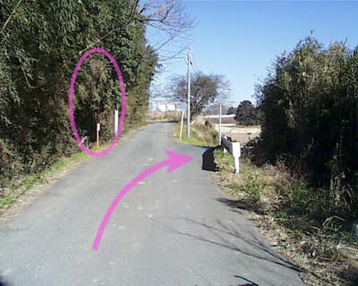 - 途中に小さな道標があるところで、安食駅からくる道と合流しますが、かまわず道なりに直進(左折?)してください。 (帰りは、ここで道を間違えやすいですから、このポイントをよく覚えておいてください)