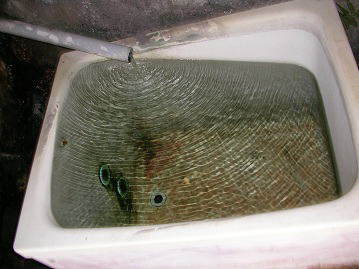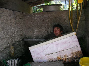 ポリ浴槽が庭に建てられた小屋の中に置かれている。湯は無色透明。