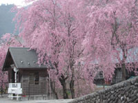 檜原街道は花街道だった。八重のシダレザクラをはじめ、ヤマザクラ、レンギョウ、ヤマブキ、シデコブシ、ミツバツツジ、まわりの淡い新緑に包まれて一層きわ立つ。(写真:人里バス停にかぶさる八重のシダレザクラ)