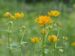友人とお花見、8時に着いた。もう日は高く、テカテカの日差しでちょっと花の撮影には不向き。でも、キンバイソウ(写真下)、シモツケ、カラマツソウが主役で、ヤナギランやクガイソウ、オオバギボウシが咲き始めた。胸まである遊歩道の植物をぶっしょくしながら丘を登って行く。ヒオドシチョウとセセリとか、ミツバチが忙しく飛び回っているが、撮ってあげようと思うと飛んでしまう。