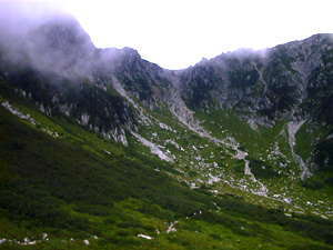 バス、ロープウェイと乗り継ぎ、千畳敷カール(2,612m)まで登る。ロープウェイがすごい、950mも標高をかせぐ。途中切り立った岩肌をエレベーターのように垂直に近く登る時は、車内でおーっというどよめきが聞こえた。ただ、またもやガスで視界は悪い。