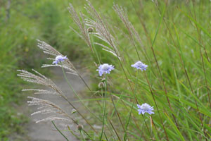 霧ヶ峰、踊場湿原ではススキが波うつなか、マツムシソウ、ノコンギク、ゴマナ、シロヤマギク、リンドウ、アザミ、トリカブト、ハナイカリ。 モズが遠くで高鳴きをしていた。ノビタキは少ない、驚いたようにホオジロが横切った。 (写真:マツムシソウとススキの穂) |