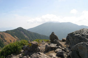 朝食前に草露に足もとを濡らしながら高峰山に登る。良い天気で、すがすがしい。 (標高2092m) 頂上は展望が開けてなかなかいい。花はこれといって・・・マツムシソウ、エゾリンドウ、アキノキリンソウ、ツリガネニンジン、ハナイカリ。 カケスがみょうな声で鳴いていた、他メボソムシクイ、ルリビタキの声、アカゲラ。 (写真:前方が高峰山) |