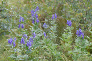 トリカブトの群生と、リンドウの群生、どちらも種類が多く同定が難しい・・・のは私だけ? 案内にはヤマトリカブトが出ていたけれど、カブトの形はツクバトリカブトに似ているが、それぞれの葉にはあまり特徴がない。また宿題(^_^;) (写真:トリカブト) |