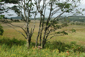 八島湿原広々とした草原は秋の色になり始めていた。 微風の中、花をながめながら木道を1周する。 マルバハギ、サラシナショウマ、ベンケイソウ、オミナエシ、ヤマラッキョウ。 向かい側あたりにアキノウナギツカミが群生していたのが印象的。 (写真:八島湿原) |