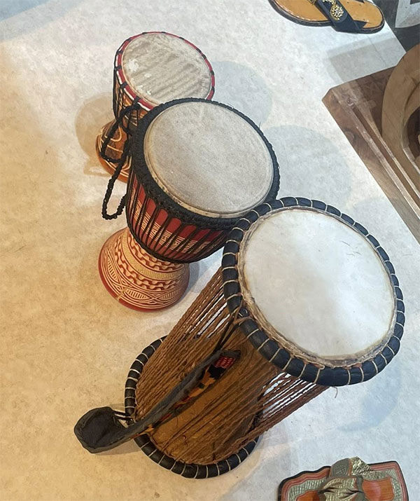 アフリカを代表する打楽器です。木をくりぬいて、動物の皮を張ったドラムで、素手で叩いて演奏します。