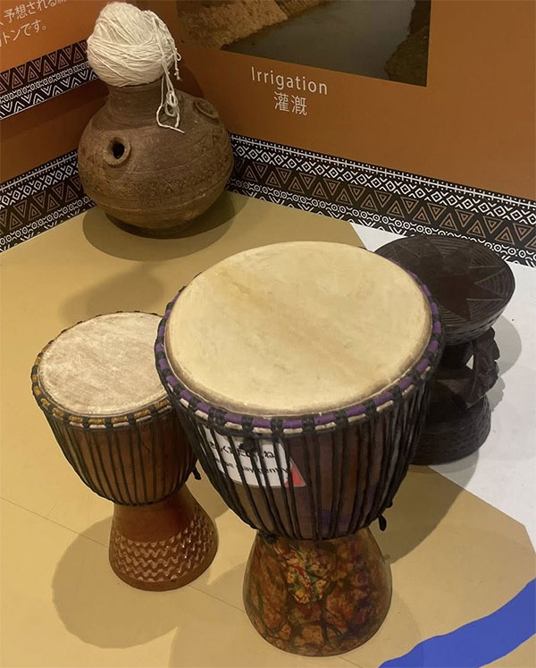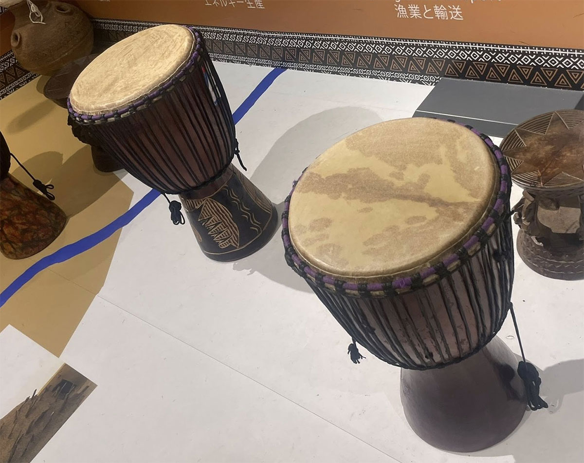 ガーナの区画に展示されていたものです。 手前のはトーキングドラムだと思います。 |