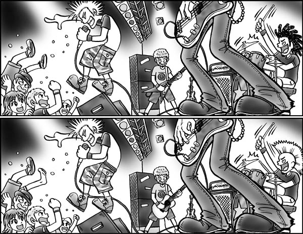今は亡き「BADGE」という音楽雑誌(リットーミュージック)で描いた、まちがい探し企画のイラスト。この中に5箇所あります。