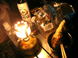 ヒマな時間をどうにかやり過ごして、苫小牧着。今年は初日から遠くへ走るのはやめて、目的地は日高。去年泊まってよかった沙流川キャンプ場に、まだ明るいうちに着。セイコーマートの脇で売ってたハスカップソフトがなかなかうまかった。 今年買った炭焼き道具「コンパクトストーブVHS」を活躍させるべく、鵡川でししゃもの干物を買ってみた。10匹で500円! それと日高の町では炭を調達したんだけど、お盆後だからかコンビニや農協ではどこも売り切れ。肥料とか売ってるような店で、2kgだけ量り売りしてもらった。 |