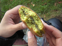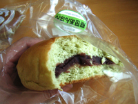 ![]() ▲熊笹あんぱん。生地に粉が練り込まれているのか、緑色。うまい。 |