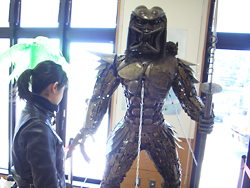襟裳岬へ行くのは、実は初めて。前のバイクに乗ってたときも入れて今年が10回目の北海道なのに。国道38号から336号に入り、どんどん南下。景色としてはあまりおもしろい感じではないですな。気持ちいいことは気持ちいいけど。時々海がチラッと見えたりして。 と、大樹町の道の駅で怪しい物件に遭遇!何故かプレデターであります。プラグやボルトなどクルマの部品や鉄筋を使って構成されているようですが。さらに謎なのは地元の人が作ったとかじゃなくて、輸入したものらしい…。 |