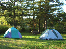 ヒラオカ君が使うテント(左)はおれが前に使っていたツーリングポイント2っていうやつ。学生時代に買ったものだけど、まだいけるんじゃないかと。ここ3〜4年は畳んだままだったけど、ポールのゴムも健在でよかった。慣れてきたらよさそうなのを買ってね。 テントの張り方の仕方を指南しつつ、無事設営完了。明るいうちにできてよかった。ソロでキャンプ場探しに手間取ると、暗い中での設営なんてケースも多いし、早いところ慣れてほしいもんです。 |