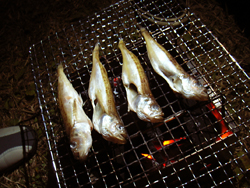 晩めしは簡単にちゃんこ鍋(既成のだし汁と切ってある野菜のセットを使った)と例によって炭火焼き。外でやる鍋はやっぱうまい!しめはうどんを投入して。 あとやっぱり炭火で焼くとなんでもうまい。今回はハタハタの干物とソーセージを焼いた。日暮れが早いので、めし食って酒飲んでまったりしたところでヒラオカ君が時計を見て『まだ7時40分ですよ』って早!! けっこう寒いので焼酎のお湯割りを飲んでいたが、炭火が終わりに近づいたのでお開きに。星空は激しくきれいだったな〜。 |