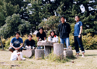 6日目 5月4日(木) 明るくなって、自然に目が覚めた。昨日の酒の悪影響はないようで、まあ爽快な起床。天気はよい。龍田さんと橋本さんも起きてて、龍田さんが炊いてくれた米と朝からいきなり焼肉を食べる。なぜかけっこう食えちゃう。普段は朝飯なんて食欲ないからほとんど食べずに出勤してるのに。健康的な野外生活のなせるわざか。そうこうしてるうちに、しんじさんやみんなも起きてきた。 今日は午後のフェリーに乗って本土に戻る。それまでに時間はたっぷりある。テントの周りでみんな片づけをしたり地図を見たり、のんびりする。何も煩わしいことを考えなくていい時間。