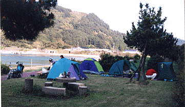 中村キャンプ場はツーリングマップルにはあんまりしっかり記載されていないので、あんまり来る人はいないみたい。今回はうちら6人だけでした。でもしっかりトイレも水場もあって、芝生地だし、けっこうよかった。海のすぐそばで。ホントに海がきれいだったな、入ってみたら冷たかったけど。