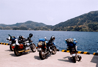 港に停めた4台。龍田さんのモンキーの荷物の高さに注目。こんなフェリーが入ってくるような港も海が青い!