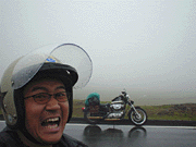 これより外輪山を越え、阿蘇の中心部へと向かう。ありきたりな国道はつかわず、ちょっとマイナーそうな県道319号。こういう道を使って、国道とは違ういい景色を探すのが好きだ。メジャーな道はいい景色もあるが、手が加えられすぎていて面白味がないことが多いから。 とは言うものの、こんな天気じゃ何にも見えない。標高を上げるにつれ辺りはすっかり雲の中、真っ白け。な〜〜んも見えやしない。トホホ… たんたんと山を降りていくと、すっかり雨。阿蘇中心の山も当然雲の中。どーすんだよー。どーしようもない。テントを張りっぱなしで明日は身軽で走り回る計画が…はっきり言って雨の中テント張りたくない。5/3に広島辺りで米子から来るしんじさん&龍田さんと、旭川のじーじさんとキャンプやる予定だから、それまでテント濡らしたくないのだ。ぜいたく言ってるようだがそこが今回の旅のメインエベントでもあるわけだし。