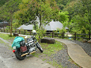 明け方どえらい雨の音をシュラフの中で聞いた気もしたが、そばを流れる川の音と区別がつかない。起きてみるととりあえず雨は上がっているようだが… 今日の予定は阿蘇まで走り、阿蘇でキャンプ泊。テントを張りっぱなしで明日1日走り回るつもりなのだ。が、天気は優れない。同じキャンプ場の常設テントを借りていた大阪のZZ-R250のオイサンと話した。宮崎方面へ向かうとか。後で晴れるという話だが、出発時はカッパ着用だ。オイサンの出発を見送り、準備。阿蘇はけっこう近いので、焦ることはない。