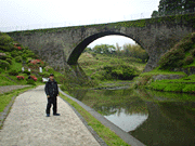 国道265号線で北上。すごいクネクネの山道。山深さで有名な椎葉村を通る。平家の落人が住み着いたという頃の様式を残す『鶴富屋敷』を見学。なんか昔の民家、って感じ。まあいいか。いよいよ熊本県に入り阿蘇に行く前に、水道を兼ねた石の橋『通潤橋』(写真)を見に。これまた期待していた物より小さくささやかで…どーも天気が悪いせいか気分がのらない。青空の下で見たらもっとすごいのかな〜。ここで昼飯を。川魚と熊本の「だご汁」などがセットになった「いしばし定食」。うむ、いいんでないの。変に作られた感じじゃなくてナチュラルな味わい。ちょっと元気出てきた。しかし晴れる気配は全くないね〜それどころかしっかり降ってきた。