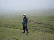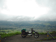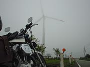 途中で写真を撮っていたら、先に出た二人組が他から来た仲間と合流して走り去るのに遭遇!阿蘇山頂で再会。しかしここがまた全く雲の中!!火口なんてまったく見えやしない。メガネは速攻曇る。っていうか濡れる。そこから下って昨日見えなかった草千里へ。今日はまだマシ!5人と一緒に草原の中へ。時々雲が流れてきて何も見えなくなるけど、スケールのでかい風景を楽しんだ。 右の写真は草千里のちょっと高くなってる丘の上で。カッパはもう常時着用。昨日と同じ辺りで撮った写真はココ★ こういう旅先での、走る向きが同じ者同士でなんとなく一緒に行動するのって、面白い。お互い名前も知らなかったりするんだけどさ。
