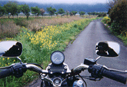 やまなみハイウェイに入って飯田高原辺りからかなり雲行きが怪しくなり、雨が降ってきた。霧(雲?)で視界も悪い。むこうからバイクが来るたびに目を凝らし、ぽいさんか否かを確認。その間、手をあげて挨拶。今回の雨の中の走りではバイク乗り同士の挨拶が欠かせなかった。こんな天気の中では走るのもいやになってきちゃうけど、お互い「がんばってるな!」「がんばれよ!」って感じで手を挙げて挨拶交わすと、楽しくなって来ちゃうんだよね。 そんなこんなで走ってたらすれ違いざま、見覚えのあるシルバーのスポーツスター1200Sが!おお〜〜〜!ぽいさんだ!東京を離れること数100km、九州の大地で会えたっ!!なんだか感動。イエイ!!が、雨の中なので再会のヨロコビもそこそこに(?)キャンプ場のある瀬の本高原へ戻る。こっちはまだ降ってはいない。さ〜て買い出しに行って宴の準備だ!!(写真は瀬ノ本のドライブインの駐車場で。ぽいさん号、荷物満載!)