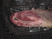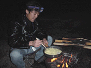 ってなわけで買い出しを済ませ、バンガロー前で晩餐。いちおうオレの30歳とぽいさんの3●歳を記念したパーティでもある(?)。メインは焼肉。借りてきたセットでガンガン火をおこし、肉焼く。食う!馬刺!ビール!うめえ〜〜〜お互いのそれまでの旅の話など色々、盛り上がる。雨も降ってこないし、バッチリじゃないスか!「味付け失敗しようのないメニュー」などといいつつ、ぽいさん作の焼きそばもうまかったっす。他にも色々買いすぎた?ってくらい。(笑)使い切らないほどの薪を用意して、夜は更けていく…