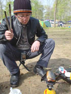 朝、晴れている。気持ちいい。その辺のファミリーキャンパーたちもボチボチ動き始めた。キャンプすると妙にいつもより早起きしてしまう。明るくなるのに敏感だからか。考えてみるとこの旅の最中、たいがい日常生活より早起きしていた様な気もする。旅に出て規則正しく、健全な生活になる(酒は呑むけど)。堕落しきった普段の生活から離れるってのも、たまには必要なことなのだろう。龍田さんは朝、すでに国民宿舎の風呂に入ってきたという。すげー。ボチボチ朝ご飯。去年に引き続き、龍田さんが米を炊いてくれた。ちょっとコゲがあったけど、それもまたよし、うまい!しんじさんはこれまた去年と同じくなかなか起きてこない。(→サバ焼き管理人、じーじさん。)
