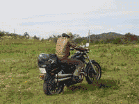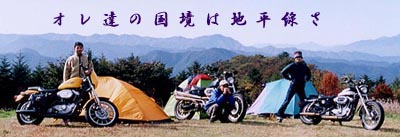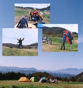 目覚めてみたらまたしても快晴!なので暖かいかな〜と思ったけど、やっぱり風は冷たかった・・・ま、いいでしょ。しっかしすがすがしい晴れ方!あっちの山は一体どこだ?よく分からんけどいい眺めだから、それ以上は考えない! ってなことで朝食。鍋の残りに昨日買った群馬産の太めのうどん(名前は忘れた!)とLOVELE$$さんがしっかり気を使って取っておいた下仁田ネギを入れ煮込む。鶏肉のダシもきいてなかなか美味でした。あとジュンが名古屋出張で仕入れてきた「すがきや」のインスタント味噌煮込みうどん。初体験のLOVELE$$さんにはお土産に持っていってもらいました。 そしていつに間にか時間は10時にもなり、もともと人が少なかった広々した草っぱらのサイトはほとんど貸し切り。「よし、スティーブ=マックイーンの『大脱走ごっこ』だ!!」と草原をバイクで(ゆっくり)駆け回り、写真撮影!!荷物積む前にやるんだったな〜〜 ここでちょっと笑えるアクシデント。下の動画参照。ぷぷ。 |