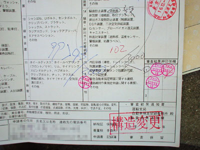 ■再チャレンジ■ 事前に再度電話にて予約を入れておいて、鮫洲へ。ここでいきなりひとつ失敗したのは、再チャレンジできる制度があることを知らなかったこと。検査で一回ダメでも、その日から15日以内なら同じ書類を使ってダメだった箇所だけの再検査を受けられるそうだ。「その日のうちなら何度でも再検査OK」ってのは知っていたけど、日を改めてもいいってことは知らなかった!ので、また1400円払ってしまった…。無駄金だ! なので今回も一から検査していた。勝手が分かっているので検査官がいなくても進められるぞ。だがしかし!光軸検査で「×」が。あれってバイクの向きもタイヤ固定機に挟まれる角度で変わるし、相当いい加減な気がするぞ。しかし「○」にしないと車検証を新しくできないので、ちょっといじって再度チャレンジで「○」、終了。 ちなみに今回勘違いで一から検査をやってしまったので、ノーマルサイレンサーのことは気にもかけられずに、検査は全部終了。いいのか…?このときはまだ1400円無駄金だったことに気づいていなかったんだけど、検査官が光軸で引っかかったビッグツイン乗りに「15日以内ならOK」ということを説明しているのを小耳に挟んでびっくり。 そのことを確認して、前週にマフラーでダメだった事情を話して、測ってもらうことにした。せっかく換えたのに測定されないってのも何か悔しいから。しかしここでアウトでも困るので、書類には検査OKの最終印を押してもらってからだけど。(笑) さすがにノーマルサイレンサーは静かで、93デシベルだった。これで気がすんだワイ。ということで、書類を出して手続き完了!(結局2回分の書類両方とも提出した。)住所変更関係の書類はこのとき一緒に出した。新しい車検証はグレーっぽい色だった。前はオレンジっぽかったのにね。