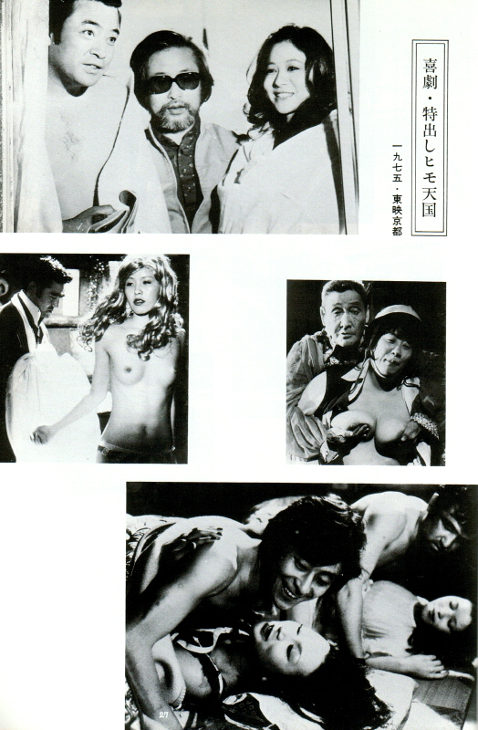 『喜劇・特出しヒモ天国』作品紹介 (山根貞男) 『世界映画作品・記録全集』(キネマ旬報一九七七年711号) ストリッパーとそのヒモの生態をごった煮のごとく描いた艶笑譚ふう映画。さまざまな男たちがストリッパーの協働者・ヒモになる。セールスマン・昭平(山城新伍)は、ジーン谷(池玲子)に惚れ、ストリップ劇場支配人を経て彼女のヒモに。大西刑事(川谷拓三)は特出し取り締まりを縁に、アル中のヨーコ(芹明香)のヒモへ。その他オカマとは知らずにサリー(カルーセル麻紀)に惚れた男(川地民夫)、あるいは聾唖者の若い夫婦(下條アトム、森崎由紀)、子持ちの女(中島葵)と初老の大工(藤原釜足)など、幾組ものカップルが登場。彼らの賑やかで裏悲しい生活風景が、ショー巡業に沿って描かれる。ヨーコが乱酔して裸で暴れまわるシーン、焼け死んだ初老のヒモの通夜をするラスト近いシーンなど、底辺に生きる人間の狂おしさを謳って秀逸。松竹を離れた森崎東の第一回他社作品で、まとまりに欠くきらいはあるが、ごった煮のヴァイタリティーは発揮されている。 『喜劇・特出しヒモ天国』 略筋 野原藍 <『森崎東篇』より> 26年ぶりの2011年3月9日午前2時、CS東映チャンネルで初放送。その際の池田の追記部分を桃色文字で示した。 京都の街。さっそうと歩くジーン谷(池玲子)はストリッパー。A級京都の裏口から入ってすぐに舞台へ出る準備をする。小屋の裏手は墓場になっていて、お寺では坊さん(殿山泰司)がおばあさんたちを相手に「死後の世界」はわからんと説教をしていた。タイトル。説教を聞いている人々のいちばん後ろに酔って寝ているアル中のヨーコ(芹明香)がいた。 自動車会社のセールスマン、サラリーマンの昭平(山城新吾)は、その日もA級京都ミュージックというストリップ小屋で、 ある日、例の大西刑事がまた来ているのに目をつけステージに引きづり上げたら、客も騒ぎ立てるわ、一方、ヒモになりそこねた善さん、次は街でスカウト作戦に出た。工事現場で赤旗振ってたオバサンで、色白、モチ肌、タレデカパイの大女(松井康子)をスカウト。 控え室では売れ残りのドブスとの言葉が投げつけられるリズ小原(絵沢萌子)はしょっちゅう仲間のストリッパーともめ事を起こしている。 オカマのサリー小夏(カルーセル麻紀)を女だと信じ、結婚したいっても九州は長崎から建築会社を辞めて出てきたオメデタイ男義一(川地民夫)。ショウコのものを見せるまで信じないんだから。取っ組み合いの果て、義一はサリーのヒモに。 小旗を小道具に「赤上げて、白上げて」の善さんの振り付けもピッタリで、押し出し立派なストリッパーに。 食堂の 義一ことギッチャんはラーメン屋に勤めたかと思えば次に大工、そして警察官。果てはヒモにおさまってしまった。一方、善さんが仕込んだ大女は春田千鶴として人気に。しかし、ヒモの地位は若い照明係に寝取られてしまったようだ。照明係りは照明だけでなく、千鶴のアナウンスまで担当して客にあきれられるほどだ。ヒモ仲間は「ヒモ稼業はいちが顔、二が持ち物、三四が無くて、五が親切」、善さんには親切しかないもんなあと噂し合う。また、ひと興行が終わって女たちをバスで駅へ送った昭平。帰って来ると、ジーン(池)がかおるの踊りを見せて「明日から舞台へ立てる」と太鼓判を押していた。残ってさびしい昭平は、ヒモのいないジーンとデキて、ひさしぶりの雪がふる日、ジーンは種子島生まれの本名は「ふぶき」と分かる。昭平「えらいさぶい名やな」と感想。ジーンは「お別れやね。明日からコース取るんや」と言う。昭平「そうか、いくんか」。二人は抱き合う。BGMに野坂昭如のLP『鬱と躁』にも収録されていた春歌「ななつ、泣いてする、別れのボンボ」よ」が響く。観客にはこの「コース取る」ということの意味が分からない。なんの説明もないからだ。しかし、後でもう一度この言葉が出てくる。コース取るというのはストリッパーがお定まりの地方巡業に出るという意味なのだ。 翌日、菊かおるの初舞台。BGMは「バラが咲いた」だ。順調に始まったものの、途中でテープが伸びて曲が中断。音楽が途切れたのに踊っているかおるに、客が怒声をあびせる。客の様子にすっかり萎縮してしまうかおる。音楽が再開したが、かおるには聞こえない。ター坊も心配で見つめるなか、かおるは決心したように全ストで、高く脚を上げて踊り始めた。客は大喝采の拍手を送る。 桜の季節となり、昭平はもうさびしくないって支配人をやめて、ジーンのヒモになり、大阪は「春乱開花」の金港ミュージックへ。ヒモになりたての昭平、毎日ジーンからお金もらっちゃ競艇通い。こりゃやめられないヒモ稼業、善さんの気持がよくわかる、なんて思ってたら、その善さん、来ましたね。赤ん坊おぶって、もう一人の女の子の手を引いて。うーん、子持ち女(中島葵)のヒモとは。ヒモの鏡ですね、善さんて。ヨーコと大西、サリーと義一、ター坊にかおりもや