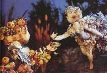 スザンナ・ロス Susanna Ross as Winter《舞台裏で》 監督のモシンスキーは、37の劇中唯一18世紀に設定されたこの物語を製作中、インスピレーションのために、ワトーの絵とモーツァルトの音楽、ピェール・ド・マリヴォーの作品を使った。 ![]() 映画『夏の夜の夢』 池田博明 (1) 監督・脚色マイケル・ホフマンの映画『真夏の夜の夢』(1998年、20世紀フォックス)は、時代を19世紀初頭、自転車が流行し始めた頃に設定している。恋人たちは森へ自転車で駆けこんでくる。森の中では、自転車がお荷物になったり、妖精パックが初めて見た自転車を生き物のように扱ったりと、面白い小道具として生かされている。120分。 しかし、時代設定はそれほど厳密ではない。公爵の祝宴の準備の席から小人に化けた妖精が盗んできた蓄音器やレコード盤を不思議そうに見たり、ボトムが蓄音器でレコードをかけてみせると、そこから流れ出る音楽に驚いたりする。蓄音器の発明は19世紀末なのだが、ボトムの「魔法」の趣向としては面白い。BGMに『椿姫』の「乾杯の歌」や『ノルマ』のアリア、ドニゼッティやロッシーニの歌劇のアリア、「メンデルスゾーンの“真夏の夜の夢・序曲”“結婚行進曲”」が使用される。 ボトム役のケヴィン・クラインが、妖精の女王に愛されてしまう突然の体験に戸惑う、芝居好きの職人を見事に演じている。ヘレナとハーミアの争いも可笑しい。「背が低い」ということが争いの種になっていたりして滑稽である(これは原作通りだが)。 職人たちの演じる劇中劇は失敗続きのドタバタだったのだが、ピラマスが自害した後、シスビーの台詞に至って、女形が裏声を使わずに地声で話してしまい、かえって真情あふれる出来になる。 ●音楽サイモン・ボズウェル、撮影オリヴァー・ステイプルトン、編集ガース・クレイヴン。 シーシアス公爵ディヴィッド・ストロターン、その婚約者ヒポリタ役ソフィー・マルソー、ハーミア役アンナ・フリール、その恋人ライサンダー役ドミニック・ウェスト、ヘレナ役カリスタ・フロックハート、デミートリアス役クリスチャン・ベイル(『太陽の帝国』『ヘンリー五世』)、職工ボトム役ケヴィン・クライン、妖精の王オベロン役ルパート・エヴェレット、女王タイテーニア役ミッシェル・ファイファー、道化パック役スタンリー・トゥッチ。 ●毒のない喜劇として映画化されたものにマックス・ラインハルト&ウィリアム・ディターレ監督のオール・スター映画『真夏の夜の夢』(1935年、市販のビデオ)がある。 妖精パック役が子役ミッキー・ルーニー、ボトム役が写真のジェイムズ・キャグニー。![]() ●ホール監督の暗い喜劇映画(1969)や、背徳と頽廃のリンゼイ・ケンプ劇団の『真夏の夜の夢』(1984、市販のビデオがある)などは未見。 (2)エイドリアン・ノーブル脚色・監督、製作ポール・アーノット、ロイヤル・シェイクスピア劇団の『A Midsummer Night Dreams』を見ることができた(アメリカからビデオを購入したが、2001年にDVD版も日本で発売された)。チャンネル・フォーと英国芸術協会が協賛、エデンウッド・プロダクション提供、作曲及び指揮ハワード・ブレイク、撮影監督イアン・ウィルソン、装置と衣裳アンソニー・ウォード、美術監督ジョン・フェンナー、編集ポール・ホッジソンとピーター・ハリウッド、録音エイドリアン・ロード。上映時間103分。 少年(オッシーン・ジョーンズ)が夢を見る。少年が寝る前に読んでいた『真夏の夜の夢』が映像になって現われるのだ。少年が場面転換の狂言回しになり、事件の目撃者となって物語が進行する。床面が常に平面であり、野外ロケは皆無で、セットにドアを用いて人物の入退場を行なうなど舞台演出的なところを残し、照明や美術、特殊撮影など映画的なところを加味した大人向けの作品。 妖精たちは幻想的な特殊撮影ではなく演劇的だし、恋人たちの争いも決してリアリズムではなく、舞台上の演出が応用されている。 時代設定は現代で、職工たちは練習場所へバイクや自転車などで移動する。大きな月の前を自転車の影が横切るET風の場面がある。ボトムのバイク用のヘルメットがロバの頭に変わる仕掛けになっていた。 目撃者として少年を用いているものの、決して劇を少年の夢として描いているわけではない。少年がこれから経験するであろう恋心の変化や、恋の多様な局面を描いているように思えた。一途な恋(ハーミアたち)もあれば、受け入れられない恋(ヘレナの恋)もある。急な心変わり(ライサンダーの恋)もあるし、不釣り合いな恋(ボトムの恋)もある。観客は四組の恋人たちの心の変化と行動に自分の気持ちを重ね合わせることが出来る。 そうしてみると、この劇は通常言われているような他愛も無いおとぎ話ではないのだ。多様な恋の情景を描いた傑作なのである。多くの作家たちに愛されてきたのもうなずける見応えのある作品なのだ。 ノーブルの演出は原戯曲をよく生かした傑作である。 ●ヒッポリタ