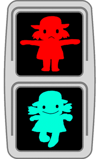 上記のイラストを見ていただきたい。従来のデザイン(右側)と比較すると、一目で「メイちゃん」と分かる可愛らしいデザインとなっている。青の「進め」は、はつらつと横断歩道を渡る姿が、赤の「止まれ」は、全身を使って止めようとしている。子どもにも親しみやすくなっている。