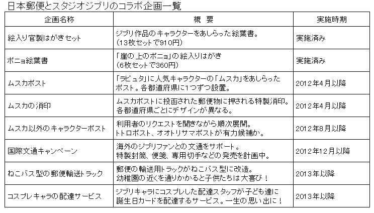 郵便事業株式会社は、郵便ポストのデザインにジブリのキャラクターを取り入れた「新型ポスト」を設置すると発表した。第1弾は「ムスカポスト」で、2012年4月、ジブリ美術館の前に設置される。「ムスカポスト」に投函された郵便物には、特製のスタンプ「ムスカの消印」が押されるという。