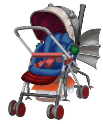 ハウルの動く城ベビーカーのオプションを装着した状態。脚のようなアロマタンク、