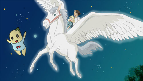 ヒロインのアンナとナゾの少年とナゾの馬の横を、ふなっしーが飛翔している!