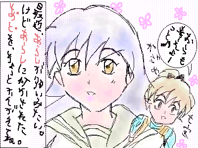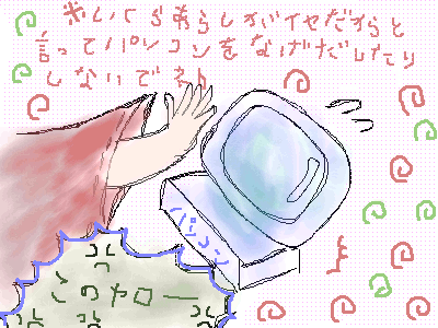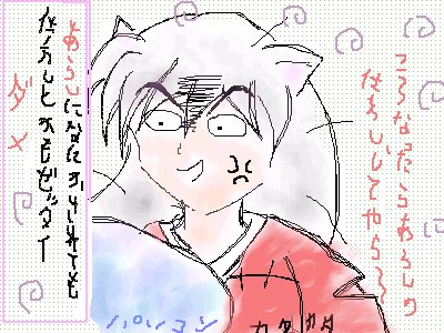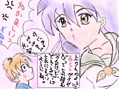 | ★ひろむさんからのアドバイス (1)「この人は"荒らし"だっ!」と思ったらすぐにチャットを退室すべきです。分かっているのにいつまでもそこに居たら、どんな目にあうかわかりません。 (2)「犬夜叉」チャット以外でも荒しはでてきます。常に気を使ってください。 (3)"荒らし"に会っも相手をしないこと。もし、しゃべってきても無視しましょう。きっといやな目にあうでしょうし・・・。 |