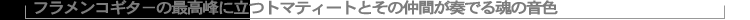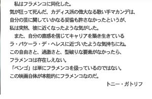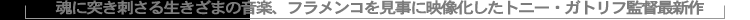 ガトリフ監督のフラメンコに対する熱い情熱と信頼のもとに集まった「ベンゴ」の最高のミュージシャンたち、フラメンコのルーツがここに終結した。崇高さ漂うサン・フランシスコ旧修道院の中を響き渡らせる、フラメンコギターの名手、トマティートの力強いギター。そして、エジプトのスーフィ教音楽の最後の伝承者である、心も体も捧げるかのごとく歌うアマッド・アル・トゥミの歌声。グアディアーナ川の上を静かに漂い、アンダルシアの真っ青な空に震えながら立ち上る歌声、偉大なるフラメンコシンガー、ラ・パケーラ・デ・ヘレス。アンダルシアの「ふつうの人々」の地をも揺るがす情熱のダンスとともに、スクリーンにあますことなく映し出せれたフラメンコの生粋がここにある。急激な変化を体験する現代人にとって、「ベンゴ」が伝える本物のフラメンコの情熱と炎は私たちの心を揺すぶり続け、何かを語りかけてくるに違いない。 |