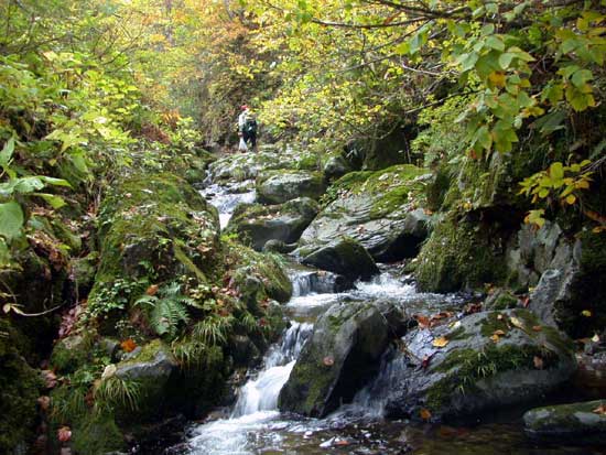 | 錦秋の沢をゆく長谷川副会長。背中に採取したキノコが一杯詰まっている。さすがです。私なんか足元にも及びません。 |