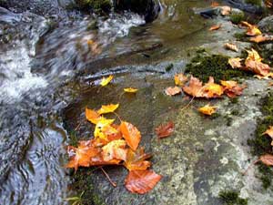 | 大量に降り積もった落ち葉に囲まれた水面は、ブナの黄葉が映え美しい。何と、こんな水溜りにも岩魚がいたのには驚かされた。近づく私に気付いた岩魚は右往左往した後、岩に頭を隠した。深まり行く晩秋のはかなさを誘う光景だ。 |