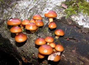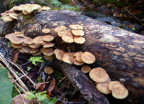 | もったいない。倒木一面に生えたサワモダシが全て腐っていた。もう一週間早ければ、小躍りしていただろう。これでは「食べてください」ではなく「残念でした」と言っているように見えた。 |