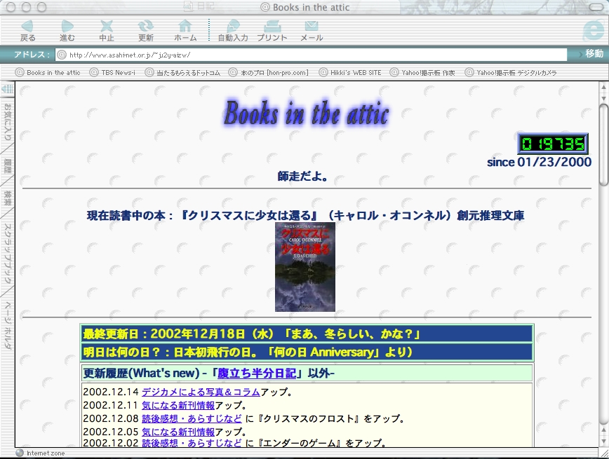 | 今日で2002年も終わりだ。明日の朝は雪が降るらしい。ここは現実的に、雪の朝を堪能してみたいかな、という気もする。別に、新年と言うこととは関係なく。