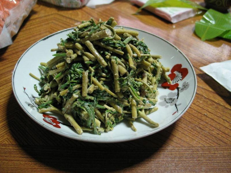 一つ目は、トリアシとアズキナを茹でてクルミ和えにしたもの。トリアシが苦めなので、クルミ和えが良く合う。