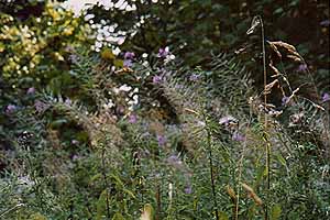 いきなり、眼下に素晴らしい景色が広がるところに出てしまった。なにもかも忘れて草むらの中にざわざわと分け行って、眺めに見とれてしまう。坂を登ってきて、少し汗ばんだ体に風が心地よく当たる。足下には紫色の花をつけたヒースのほかに、名もない雑草のような草までも小さな白や黄色や淡いピンクの花を咲かせ、短い夏を必死に生きているようだ。