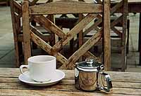 人間をこわがらないのも考えもので、私のすぐ横の空いたテーブルでは、前の人がおいていった皿の上をカラスがつつきまくって、ティーポットやカップを倒しそうにしている。それでも、だれも片付けにはこない。