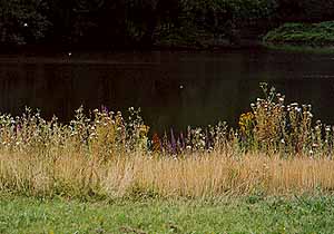池の回りにも雑草のような小さな草花がいっぱい咲いているのだが、そのどれかの種だと思われる、白くて小さなふわふわしたものが空気中に舞い踊っている。まるで夏の雪のよう・・・幻想的。