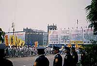 広場の中心は空間になっていて、その周囲を警官がびっしりと並んで四角く囲んでいる。その外側がデモ隊の行進路になっていて、さらにその外側、広場の外周を埋めるようにまた警官が並んでいる。警棒は差しているが、銃は持っていない。