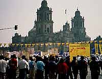 でも、あとからあとから入ってくる中に、農民の姿はないのね。大体がおそろいのジャージを買える金銭的余裕のある組合というのは、メキシコの労働者層の中でも、かなり恵まれた部分なんじゃないのだろうか?